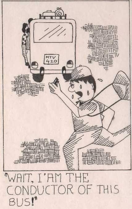 බසය බාඳුරාගොඩ හන්දියේ නවතාගෙන සිටියදී කොන්දොස්තර තී්රවීලයේ පැමිණ බසයට නැගුණේ මගීන් සිනාසෙද්දීය.